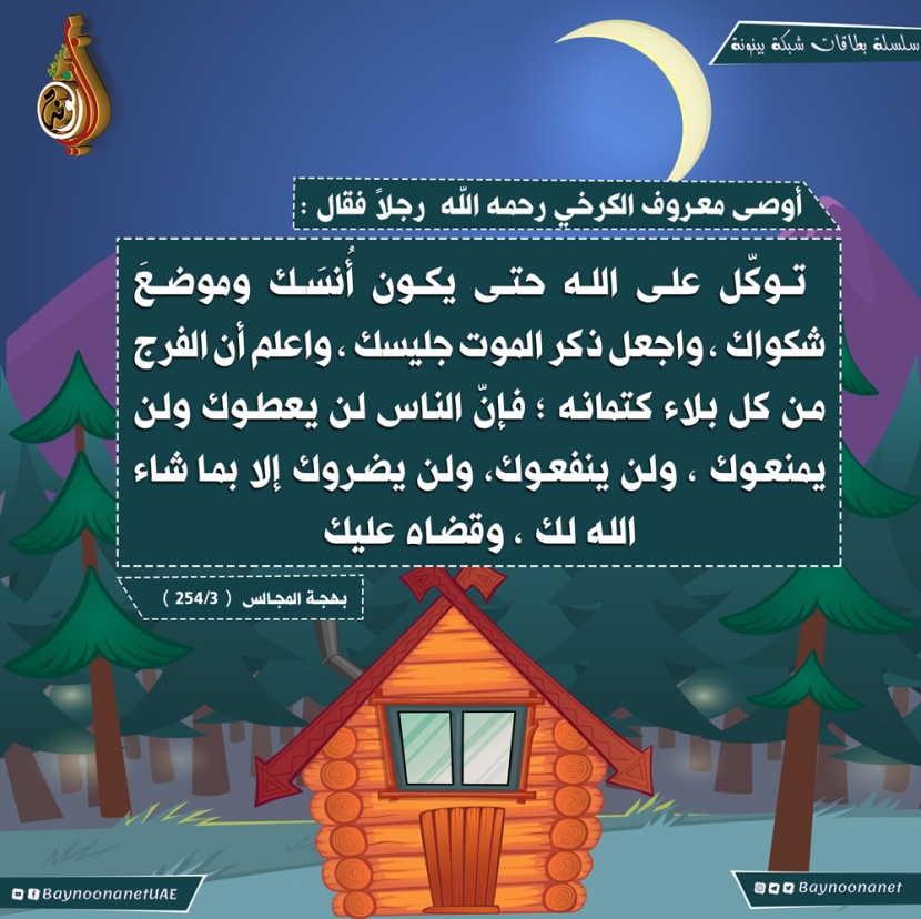 توكل على الله حتى يكون أنسك وموضع شكواك ... تاريخ الإضافة: الإثنين, 17/02/2020 - 15:35 التصنيفات صنف البطاقة: إيمانيات الشيخ: من إعداد شبكة بينونة