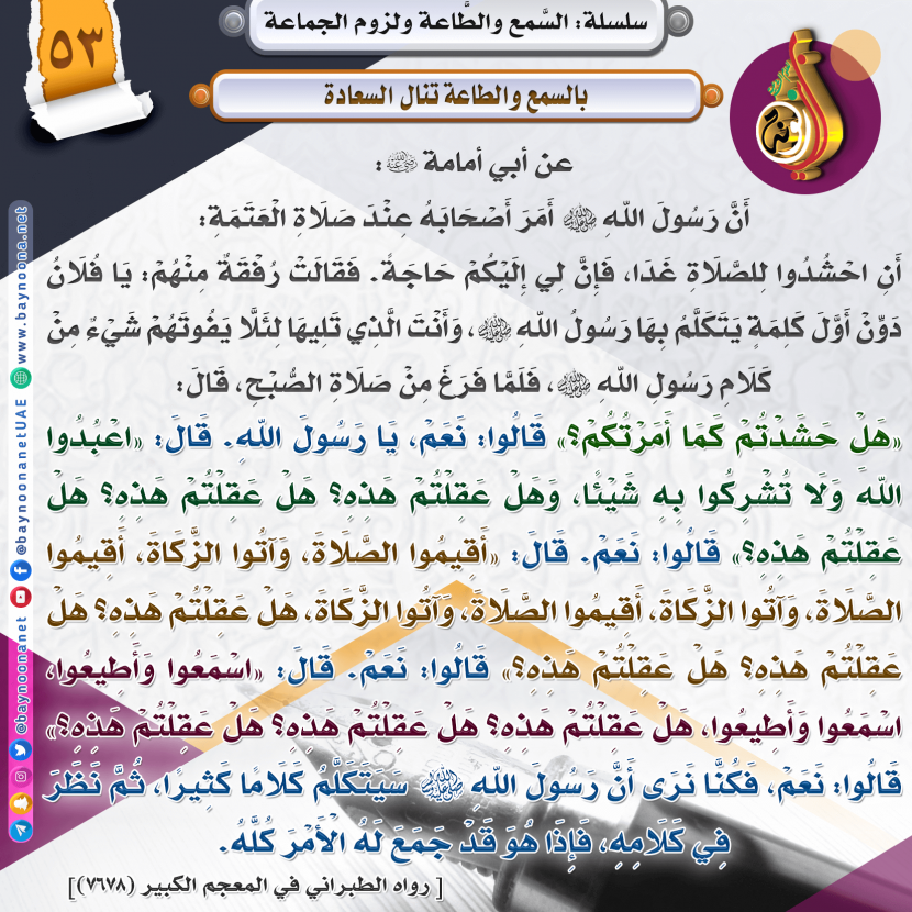 السمع والطاعة ولزوم الجماعة - (٥٣) بالسمع والطاعة تنال السعادة تاريخ الإضافة: السبت, 29/02/2020 - 16:58 التصنيفات صنف البطاقة: إيمانيات صنف البطاقة: طاعة ولي الأمر صنف البطاقة: مكافحة الإرهاب الشيخ: من إعداد شبكة بينونة سلسلة بطاقات: السمع والطاعة ولزوم الجماعة حمل السلسلة كاملة: السمع والطاعة ولزوم الجماعة