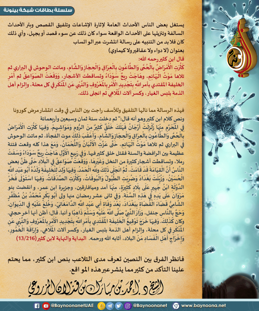 يستغل بعض الناس الأحداث العامة لإثارة الإشاعات وتلفيق القصص ... تاريخ الإضافة: الأربعاء, 04/03/2020 - 21:02 التصنيفات صنف البطاقة: إيمانيات صنف البطاقة: الأخلاق والآداب الشيخ: د. أحمد بن مبارك المزروعي