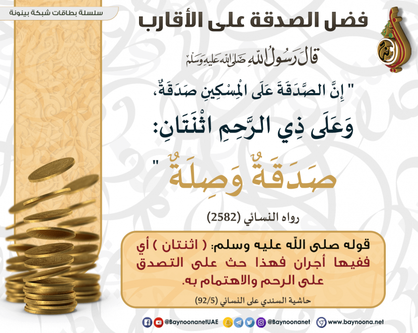 فضل الصدقة على الأقارب تاريخ الإضافة: الأربعاء, 11/03/2020 - 23:46 التصنيفات صنف البطاقة: الأخلاق والآداب الشيخ: من إعداد شبكة بينونة