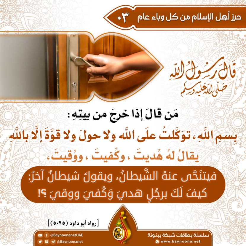 حرز أهل الإسلام من كل وباء عام - (٣) قال ﷺ: ( من قال إذا خرج من بيته: بسم الله، توكلت على الله ولا حول ولقوة إلا بالله ... ) تاريخ الإضافة: الخميس, 02/04/2020 - 14:02 التصنيفات صنف البطاقة: الأدعية والأذكار الشيخ: من إعداد شبكة بينونة سلسلة بطاقات: حرز أهل الإسلام من كل وباء عام حمل السلسلة كاملة: حرز أهل الإسلام من كل وباء عام