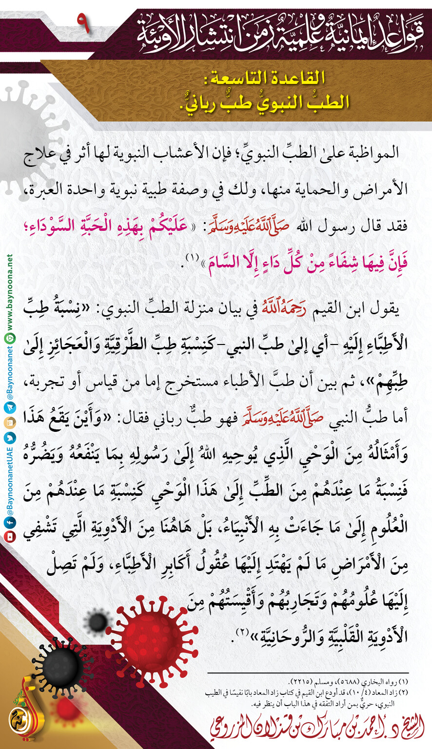 قواعد إيمانية وعلمية عند انتشار الأمراض والأوبئة - القاعدة التاسعة: الطب النبوي طب رباني تاريخ الإضافة: الجمعة, 10/04/2020 - 19:09 التصنيفات صنف البطاقة: إيمانيات صنف البطاقة: الطب النبوي الشيخ: د. أحمد بن مبارك المزروعي سلسلة بطاقات: قواعد إيمانية وعلمية عند انتشار الأمراض والأوبئة حمل السلسلة كاملة: قواعد إيمانية وعلمية عند انتشار الأمراض والأوبئة