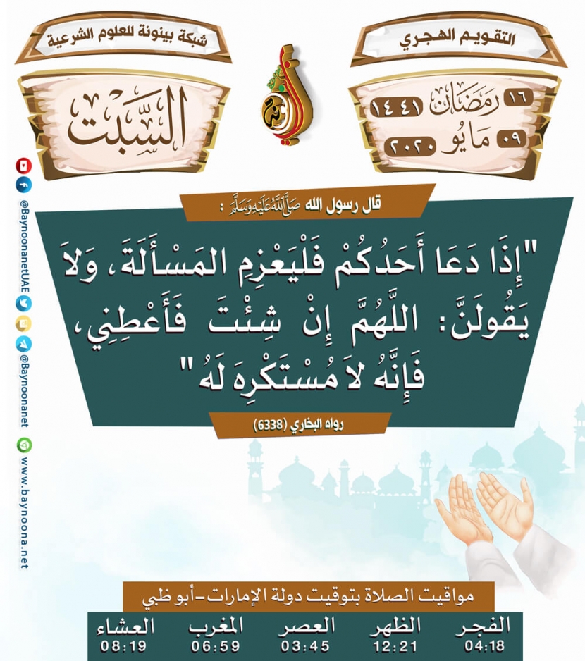 التقويم الهجري لعام ١٤٤١ هـ - السبت ١٦ رمضان تاريخ الإضافة: السبت, 09/05/2020 - 02:03 التصنيفات صنف البطاقة: عامة الشيخ: من إعداد شبكة بينونة سلسلة بطاقات: التقويم الهجري لعام ١٤٤١هـ حمل السلسلة كاملة: التقويم الهجري لعام ١٤٤١ هـ - شهر الله المحرّم حمل السلسلة كاملة: التقويم الهجري لعام ١٤٤١ هـ - شهر صفر حمل السلسلة كاملة: التقويم الهجري لعام ١٤٤١ هـ - شهر ربيع الأول حمل السلسلة كاملة: التقويم الهجري لعام ١٤٤١ هـ - شهر ربيع الثاني حمل السلسلة كاملة: التقويم الهجري لعام ١٤٤١ هـ - شهر جمادى الأولى حمل السلسلة كاملة: التقويم الهجري لعام ١٤٤١ هـ - شهر جمادى الآخرة حمل السلسلة كاملة: التقويم الهجري لعام ١٤٤١ هـ - شهر رجب حمل السلسلة كاملة: التقويم الهجري لعام ١٤٤١ هـ - شهر شعبان حمل السلسلة كاملة: التقويم الهجري لعام ١٤٤١ هـ - شهر رمضان حمل السلسلة كاملة: التقويم الهجري لعام ١٤٤١ هـ - شهر شوال حمل السلسلة كاملة: التقويم الهجري لعام ١٤٤١ هـ - شهر ذو القعدة حمل السلسلة كاملة: التقويم الهجري لعام ١٤٤١ هـ - شهر ذو الحجة