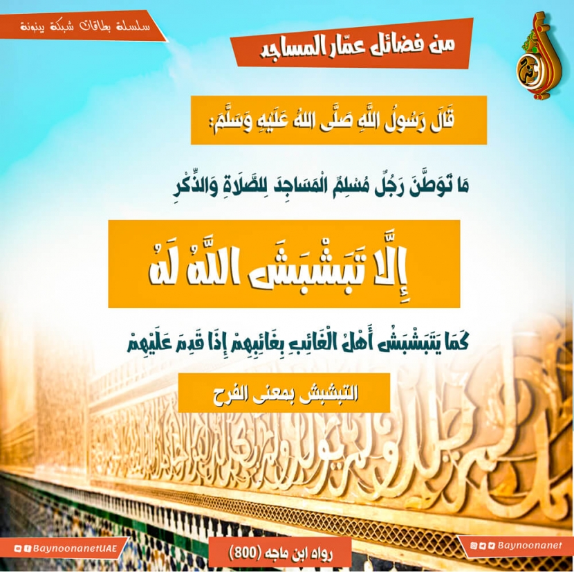 من فضائل عمار المساجد تاريخ الإضافة: الثلاثاء, 30/06/2020 - 01:34 التصنيفات صنف البطاقة: الأخلاق والآداب الشيخ: من إعداد شبكة بينونة