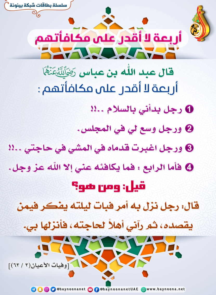 أربعة لا أقدر على مكافأتهم تاريخ الإضافة: الإثنين, 13/07/2020 - 13:30 التصنيفات صنف البطاقة: الأخلاق والآداب الشيخ: من إعداد شبكة بينونة