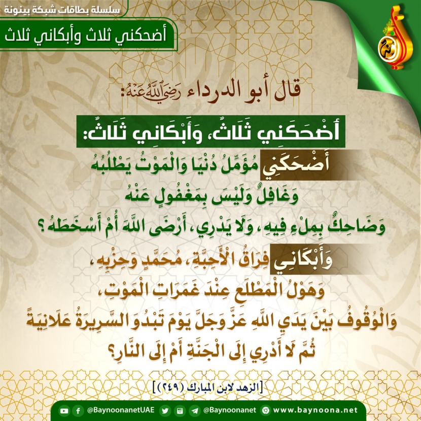 أضحكني ثلاث وأبكاني ثلاث تاريخ الإضافة: الثلاثاء, 14/07/2020 - 14:56 التصنيفات صنف البطاقة: إيمانيات صنف البطاقة: من آثار السلف الشيخ: من إعداد شبكة بينونة