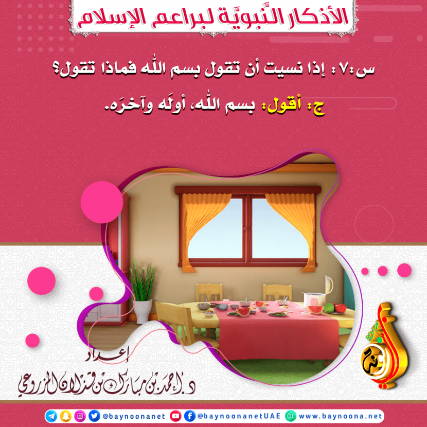 الأذكار النبوية لبراعم الإسلام - (س٧) إذا نسيت أن تقول بسم الله فماذا تقول ؟ تاريخ الإضافة: السبت, 29/08/2020 - 14:29 التصنيفات صنف البطاقة: الأدعية والأذكار صنف البطاقة: ركن الأسرة الشيخ: د. أحمد بن مبارك المزروعي سلسلة بطاقات: الأذكار النبوية لبراعم الإسلام حمل السلسلة كاملة: الرسائل التعليمية لبراعم الإسلام - (٤) الأذكار النبوية لبراعم الإسلام