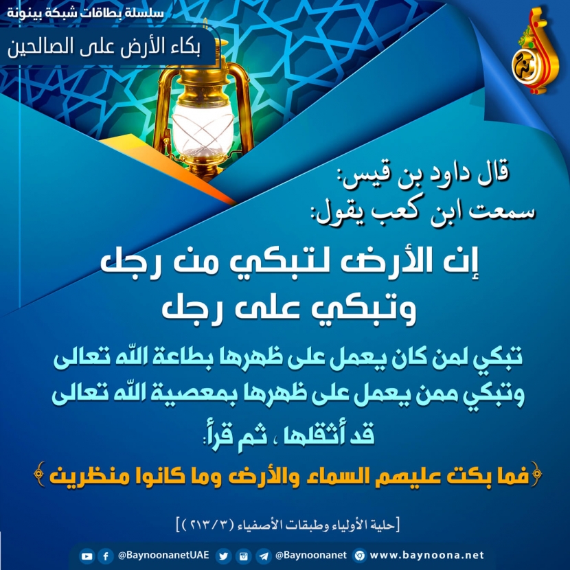 بكاء الأرض على الصالحين تاريخ الإضافة: الأربعاء, 02/09/2020 - 16:36 التصنيفات صنف البطاقة: إيمانيات صنف البطاقة: الأخلاق والآداب الشيخ: من إعداد شبكة بينونة