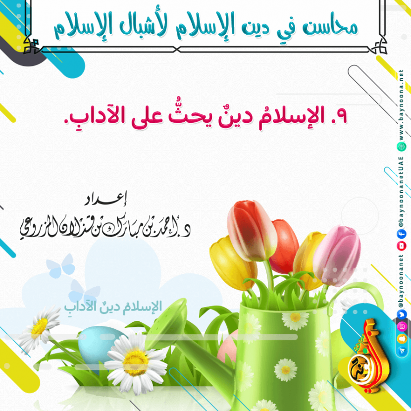 محاسن في دين الإسلام لأشبال الإسلام - (٩) الإسلام دين يحث على الآداب تاريخ الإضافة: السبت, 19/09/2020 - 14:28 التصنيفات صنف البطاقة: إيمانيات صنف البطاقة: الأخلاق والآداب الشيخ: د. أحمد بن مبارك المزروعي سلسلة بطاقات: محاسن في دين الإسلام لأشبال الإسلام حمل السلسلة كاملة: محاسن في دين الإسلام لأشبال الإسلام