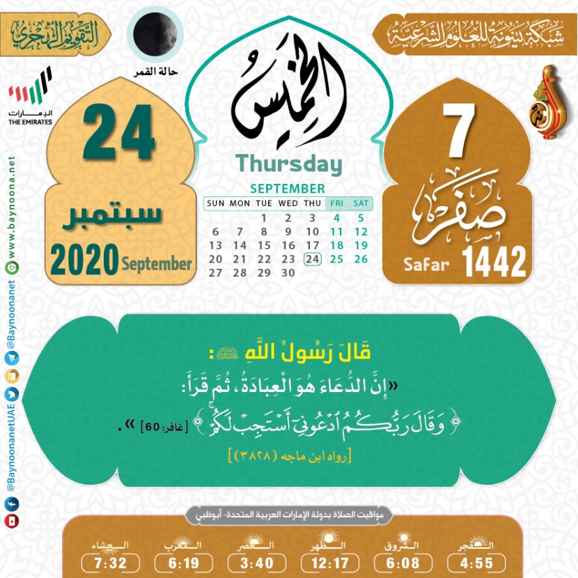 التقويم الهجري لعام ١٤٤٢ هـ - الخميس ٠٧ صفر تاريخ الإضافة: الخميس, 24/09/2020 - 02:28 التصنيفات صنف البطاقة: عامة الشيخ: من إعداد شبكة بينونة سلسلة بطاقات: التقويم الهجري لعام ١٤٤٢هـ حمل السلسلة كاملة: التقويم الهجري لعام ١٤٤٢ هـ - شهر الله المحرم حمل السلسلة كاملة: التقويم الهجري لعام ١٤٤٢ هـ - شهر صفر حمل السلسلة كاملة: التقويم الهجري لعام ١٤٤٢ هـ - شهر ربيع الأول حمل السلسلة كاملة: التقويم الهجري لعام ١٤٤٢ هـ - شهر ربيع الثاني حمل السلسلة كاملة: التقويم الهجري لعام ١٤٤٢ هـ - شهر جمادى الأولى حمل السلسلة كاملة: التقويم الهجري لعام ١٤٤٢ هـ - شهر جمادى الآخرة حمل السلسلة كاملة: التقويم الهجري لعام ١٤٤٢ هـ - شهر رجب حمل السلسلة كاملة: التقويم الهجري لعام ١٤٤٢ هـ - شهر شعبان حمل السلسلة كاملة: التقويم الهجري لعام ١٤٤٢ هـ - شهر رمضان حمل السلسلة كاملة: التقويم الهجري لعام ١٤٤٢ هـ - شهر شوال حمل السلسلة كاملة: التقويم الهجري لعام ١٤٤٢ هـ - شهر ذو القعدة حمل السلسلة كاملة: التقويم الهجري لعام ١٤٤٢ هـ - شهر ذو الحجة