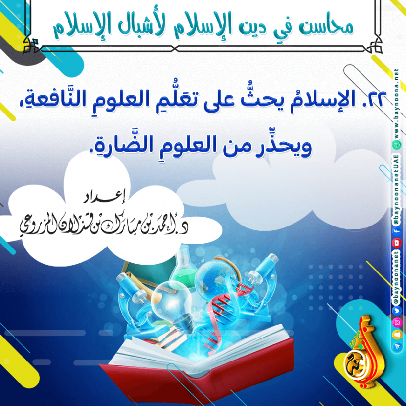 محاسن في دين الإسلام لأشبال الإسلام - (٢٢) الإسلام يحث على تعلم العلوم النافعة ويحذر من العلوم الضارة تاريخ الإضافة: الأحد, 04/10/2020 - 19:58 التصنيفات صنف البطاقة: إيمانيات صنف البطاقة: الأخلاق والآداب صنف البطاقة: طلب العلم الشيخ: د. أحمد بن مبارك المزروعي سلسلة بطاقات: محاسن في دين الإسلام لأشبال الإسلام حمل السلسلة كاملة: محاسن في دين الإسلام لأشبال الإسلام
