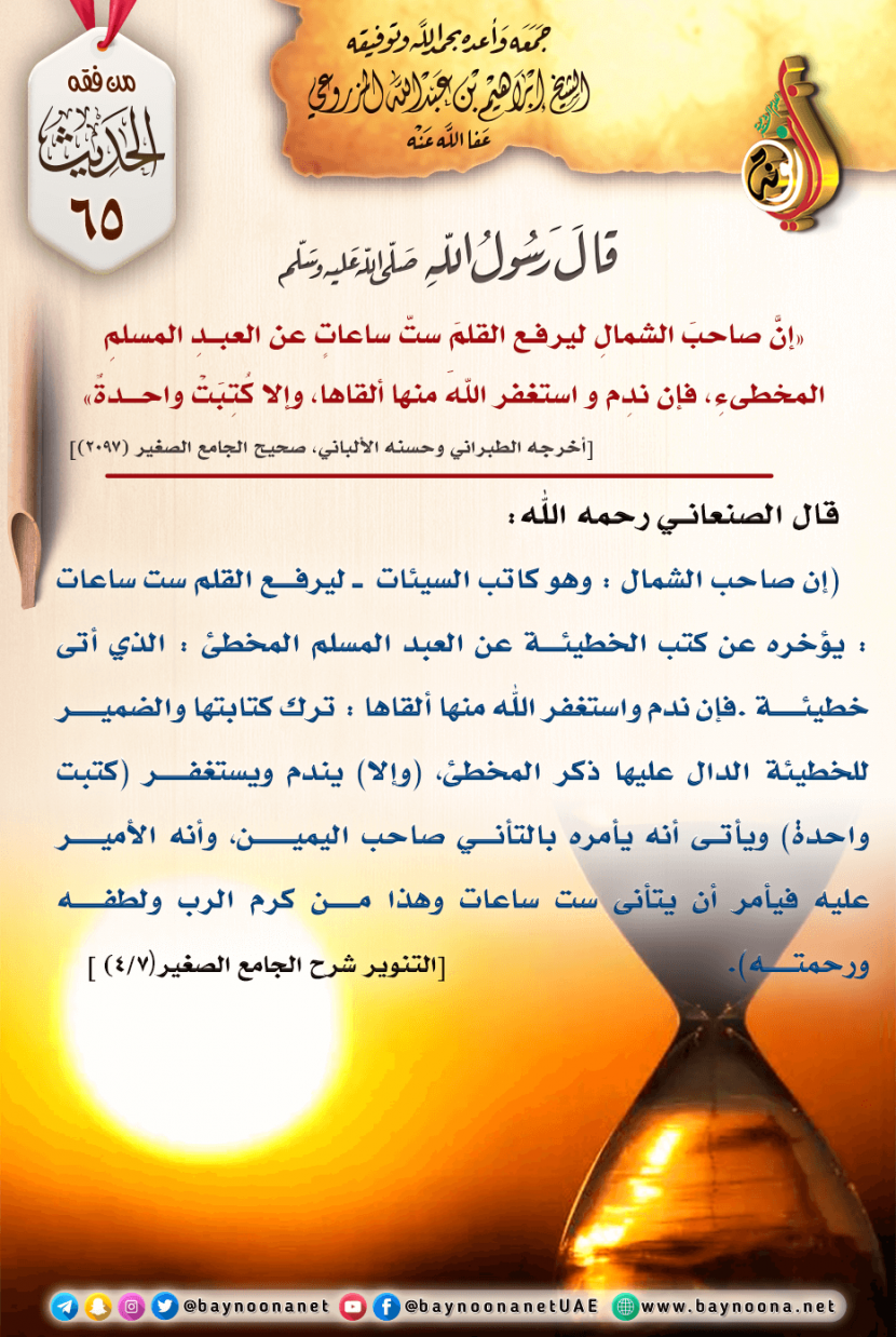 من فقه الحديث - (٦٥) قال ﷺ: ( إن صاحب الشمال ليرفع القلم ست ساعات عن العبد المسلم المخطئ ، فإن ندم واستغفر الله منها ألقاها ، وإلا كتبت واحدة ) تاريخ الإضافة: الخميس, 08/10/2020 - 13:44 التصنيفات صنف البطاقة: إيمانيات الشيخ: إبراهيم بن عبد الله المزروعي سلسلة بطاقات: من فقه الحديث حمل السلسلة كاملة: من فقه الحديث (الجزء ١) حمل السلسلة كاملة: من فقه الحديث (الجزء ٢) حمل السلسلة كاملة: من فقه الحديث (الجزء ٣)