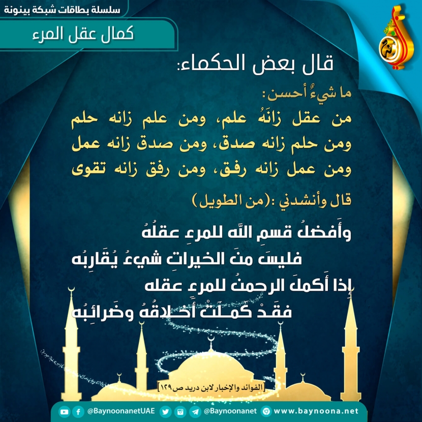 كمال عقل المرء تاريخ الإضافة: الجمعة, 16/10/2020 - 18:43 التصنيفات صنف البطاقة: إيمانيات الشيخ: من إعداد شبكة بينونة