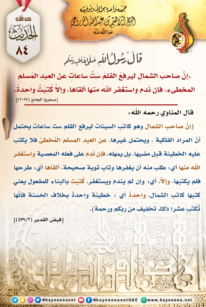 من فقه الحديث - (٨٤) قال ﷺ: ( إن صاحب الشمال ليرفع القلم ست ساعات عن العبد المسلم المخطئ ، فإن ندم واستغفر الله منها ألقاها ، وإلا كتبت واحدة ) تاريخ الإضافة: الثلاثاء, 27/10/2020 - 14:40 التصنيفات صنف البطاقة: إيمانيات الشيخ: إبراهيم بن عبد الله المزروعي سلسلة بطاقات: من فقه الحديث حمل السلسلة كاملة: من فقه الحديث (الجزء ١) حمل السلسلة كاملة: من فقه الحديث (الجزء ٢) حمل السلسلة كاملة: من فقه الحديث (الجزء ٣)