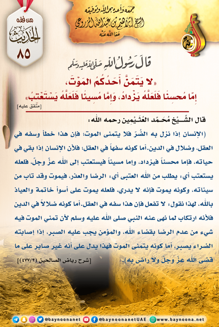 من فقه الحديث - (٨٥) قال ﷺ: ( لا يتمن أحدكم الموت ، إما محسنا فلعله يزداد ، وإما مسيئا فلعله يستعتب ) تاريخ الإضافة: الأربعاء, 28/10/2020 - 18:57 التصنيفات صنف البطاقة: إيمانيات الشيخ: إبراهيم بن عبد الله المزروعي سلسلة بطاقات: من فقه الحديث حمل السلسلة كاملة: من فقه الحديث (الجزء ١) حمل السلسلة كاملة: من فقه الحديث (الجزء ٢) حمل السلسلة كاملة: من فقه الحديث (الجزء ٣)