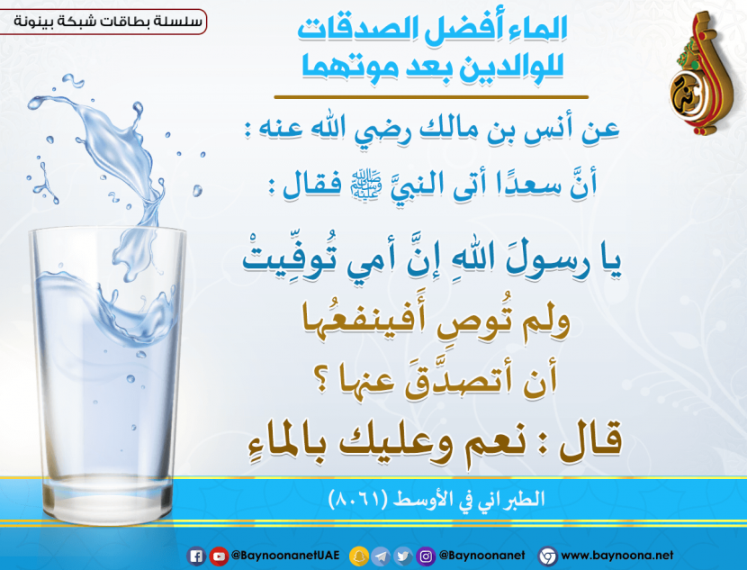الماء أفضل الصدقات للوالدين بعد موتهما تاريخ الإضافة: الخميس, 26/11/2020 - 00:39 التصنيفات صنف البطاقة: الأخلاق والآداب صنف البطاقة: بر الوالدين الشيخ: من إعداد شبكة بينونة