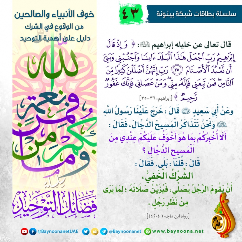 فضائل التوحيد - (٤٣) خوف الأنبياء والصالحين من الوقوع في الشرك دليل على أهمية التوحيد تاريخ الإضافة: الإثنين, 21/12/2020 - 22:58 التصنيفات صنف البطاقة: إيمانيات الشيخ: من إعداد شبكة بينونة سلسلة بطاقات: فضائل التوحيد حمل السلسلة كاملة: فضائل التوحيد