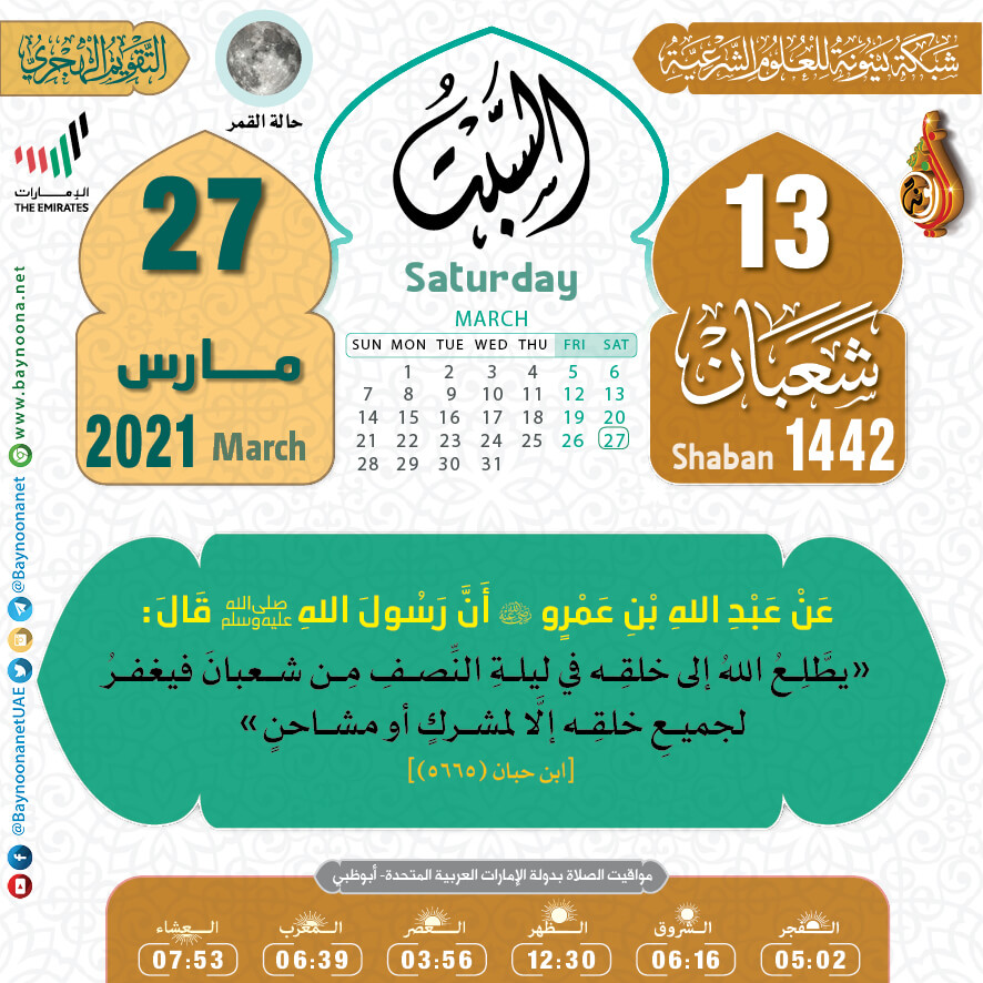 التقويم الهجري لعام ١٤٤٢ هـ - السبت ١٣ شعبان تاريخ الإضافة: السبت, 27/03/2021 - 00:35 التصنيفات صنف البطاقة: عامة الشيخ: من إعداد شبكة بينونة سلسلة بطاقات: التقويم الهجري لعام ١٤٤٢هـ حمل السلسلة كاملة: التقويم الهجري لعام ١٤٤٢ هـ - شهر الله المحرم حمل السلسلة كاملة: التقويم الهجري لعام ١٤٤٢ هـ - شهر صفر حمل السلسلة كاملة: التقويم الهجري لعام ١٤٤٢ هـ - شهر ربيع الأول حمل السلسلة كاملة: التقويم الهجري لعام ١٤٤٢ هـ - شهر ربيع الثاني حمل السلسلة كاملة: التقويم الهجري لعام ١٤٤٢ هـ - شهر جمادى الأولى حمل السلسلة كاملة: التقويم الهجري لعام ١٤٤٢ هـ - شهر جمادى الآخرة حمل السلسلة كاملة: التقويم الهجري لعام ١٤٤٢ هـ - شهر رجب حمل السلسلة كاملة: التقويم الهجري لعام ١٤٤٢ هـ - شهر شعبان حمل السلسلة كاملة: التقويم الهجري لعام ١٤٤٢ هـ - شهر رمضان حمل السلسلة كاملة: التقويم الهجري لعام ١٤٤٢ هـ - شهر شوال حمل السلسلة كاملة: التقويم الهجري لعام ١٤٤٢ هـ - شهر ذو القعدة حمل السلسلة كاملة: التقويم الهجري لعام ١٤٤٢ هـ - شهر ذو الحجة