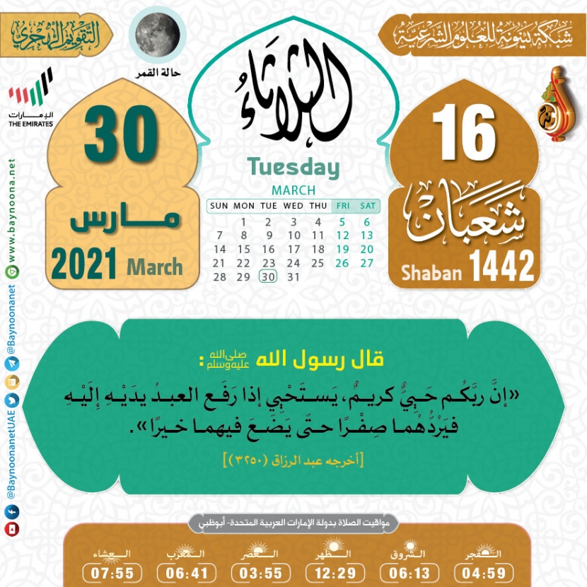 التقويم الهجري لعام ١٤٤٢ هـ - الثلاثاء ١٦ شعبان تاريخ الإضافة: الثلاثاء, 30/03/2021 - 01:48 التصنيفات صنف البطاقة: عامة الشيخ: من إعداد شبكة بينونة سلسلة بطاقات: التقويم الهجري لعام ١٤٤٢هـ حمل السلسلة كاملة: التقويم الهجري لعام ١٤٤٢ هـ - شهر الله المحرم حمل السلسلة كاملة: التقويم الهجري لعام ١٤٤٢ هـ - شهر صفر حمل السلسلة كاملة: التقويم الهجري لعام ١٤٤٢ هـ - شهر ربيع الأول حمل السلسلة كاملة: التقويم الهجري لعام ١٤٤٢ هـ - شهر ربيع الثاني حمل السلسلة كاملة: التقويم الهجري لعام ١٤٤٢ هـ - شهر جمادى الأولى حمل السلسلة كاملة: التقويم الهجري لعام ١٤٤٢ هـ - شهر جمادى الآخرة حمل السلسلة كاملة: التقويم الهجري لعام ١٤٤٢ هـ - شهر رجب حمل السلسلة كاملة: التقويم الهجري لعام ١٤٤٢ هـ - شهر شعبان حمل السلسلة كاملة: التقويم الهجري لعام ١٤٤٢ هـ - شهر رمضان حمل السلسلة كاملة: التقويم الهجري لعام ١٤٤٢ هـ - شهر شوال حمل السلسلة كاملة: التقويم الهجري لعام ١٤٤٢ هـ - شهر ذو القعدة حمل السلسلة كاملة: التقويم الهجري لعام ١٤٤٢ هـ - شهر ذو الحجة