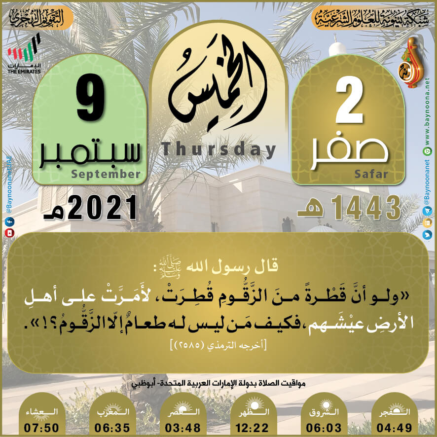 التقويم الهجري لعام ١٤٤٣ هـ - الخميس ٠٢ صفر تاريخ الإضافة: الخميس, 09/09/2021 - 01:36 التصنيفات صنف البطاقة: عامة الشيخ: من إعداد شبكة بينونة سلسلة بطاقات: التقويم الهجري لعام ١٤٤٣هـ حمل السلسلة كاملة: التقويم الهجري لعام ١٤٤٣ هـ - شهر المحرم حمل السلسلة كاملة: التقويم الهجري لعام ١٤٤٣ هـ - شهر صفر حمل السلسلة كاملة: التقويم الهجري لعام ١٤٤٣ هـ - شهر ربيع الأول حمل السلسلة كاملة: التقويم الهجري لعام ١٤٤٣ هـ - شهر ربيع الثاني حمل السلسلة كاملة: التقويم الهجري لعام ١٤٤٣ هـ - شهر جمادى الأولى حمل السلسلة كاملة: التقويم الهجري لعام ١٤٤٣ هـ - شهر جمادى الآخرة حمل السلسلة كاملة: التقويم الهجري لعام ١٤٤٣ هـ - شهر رجب حمل السلسلة كاملة: التقويم الهجري لعام ١٤٤٣ هـ - شهر شعبان حمل السلسلة كاملة: التقويم الهجري لعام ١٤٤٣ هـ - شهر رمضان حمل السلسلة كاملة: التقويم الهجري لعام ١٤٤٣ هـ - شهر شوال حمل السلسلة كاملة: التقويم الهجري لعام ١٤٤٣ هـ - شهر ذو القعدة حمل السلسلة كاملة: التقويم الهجري لعام ١٤٤٣ هـ - شهر ذو الحجة