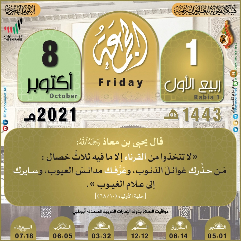 التقويم الهجري لعام ١٤٤٣ هـ - الجمعة ٠١ ربيع الأول تاريخ الإضافة: الجمعة, 08/10/2021 - 00:25 التصنيفات صنف البطاقة: عامة الشيخ: من إعداد شبكة بينونة سلسلة بطاقات: التقويم الهجري لعام ١٤٤٣هـ حمل السلسلة كاملة: التقويم الهجري لعام ١٤٤٣ هـ - شهر المحرم حمل السلسلة كاملة: التقويم الهجري لعام ١٤٤٣ هـ - شهر صفر حمل السلسلة كاملة: التقويم الهجري لعام ١٤٤٣ هـ - شهر ربيع الأول حمل السلسلة كاملة: التقويم الهجري لعام ١٤٤٣ هـ - شهر ربيع الثاني حمل السلسلة كاملة: التقويم الهجري لعام ١٤٤٣ هـ - شهر جمادى الأولى حمل السلسلة كاملة: التقويم الهجري لعام ١٤٤٣ هـ - شهر جمادى الآخرة حمل السلسلة كاملة: التقويم الهجري لعام ١٤٤٣ هـ - شهر رجب حمل السلسلة كاملة: التقويم الهجري لعام ١٤٤٣ هـ - شهر شعبان حمل السلسلة كاملة: التقويم الهجري لعام ١٤٤٣ هـ - شهر رمضان حمل السلسلة كاملة: التقويم الهجري لعام ١٤٤٣ هـ - شهر شوال حمل السلسلة كاملة: التقويم الهجري لعام ١٤٤٣ هـ - شهر ذو القعدة حمل السلسلة كاملة: التقويم الهجري لعام ١٤٤٣ هـ - شهر ذو الحجة