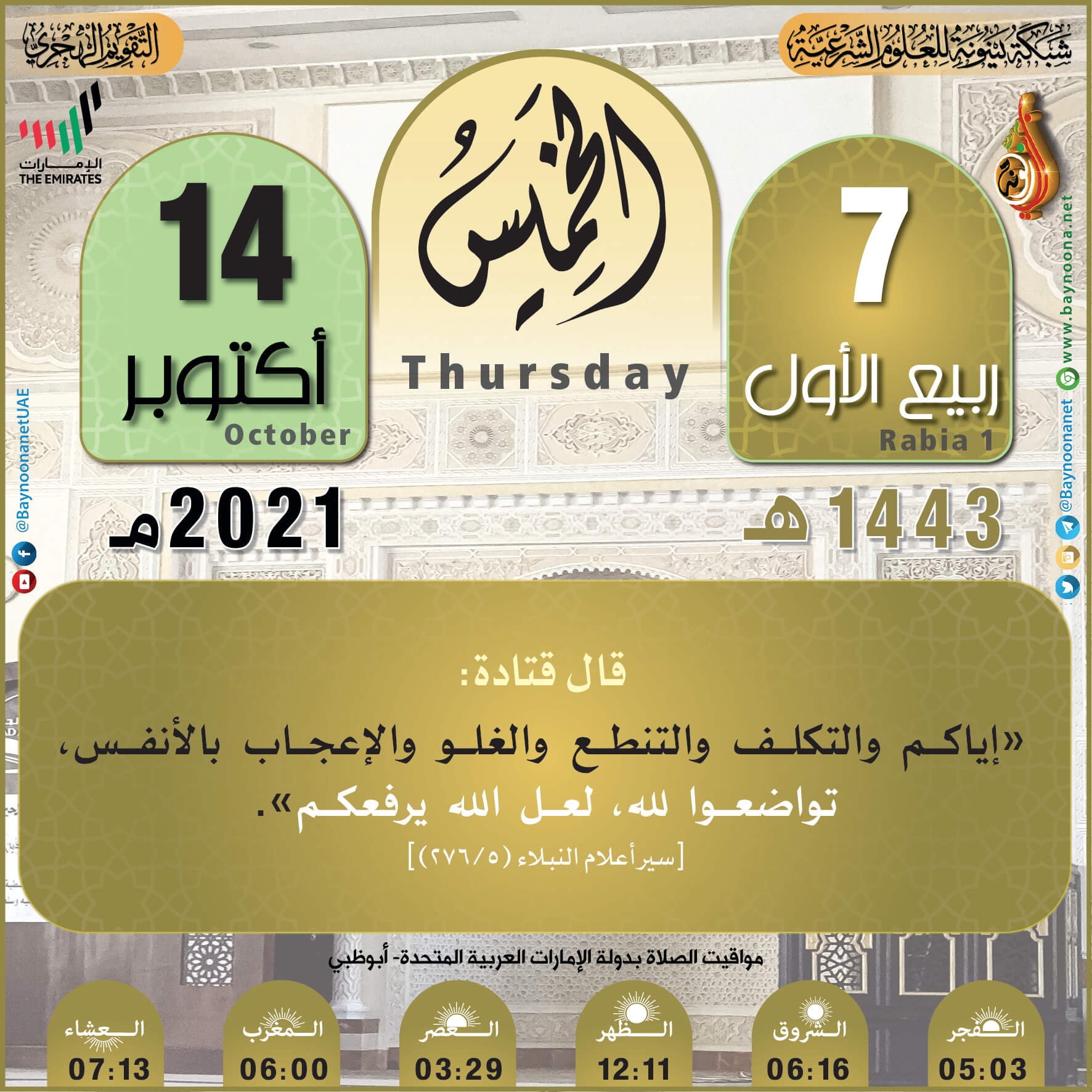 التقويم الهجري لعام ١٤٤٣ هـ - الخميس ٠٧ ربيع الأول تاريخ الإضافة: الخميس, 14/10/2021 - 00:16 التصنيفات صنف البطاقة: عامة الشيخ: من إعداد شبكة بينونة سلسلة بطاقات: التقويم الهجري لعام ١٤٤٣هـ حمل السلسلة كاملة: التقويم الهجري لعام ١٤٤٣ هـ - شهر المحرم حمل السلسلة كاملة: التقويم الهجري لعام ١٤٤٣ هـ - شهر صفر حمل السلسلة كاملة: التقويم الهجري لعام ١٤٤٣ هـ - شهر ربيع الأول حمل السلسلة كاملة: التقويم الهجري لعام ١٤٤٣ هـ - شهر ربيع الثاني حمل السلسلة كاملة: التقويم الهجري لعام ١٤٤٣ هـ - شهر جمادى الأولى حمل السلسلة كاملة: التقويم الهجري لعام ١٤٤٣ هـ - شهر جمادى الآخرة حمل السلسلة كاملة: التقويم الهجري لعام ١٤٤٣ هـ - شهر رجب حمل السلسلة كاملة: التقويم الهجري لعام ١٤٤٣ هـ - شهر شعبان حمل السلسلة كاملة: التقويم الهجري لعام ١٤٤٣ هـ - شهر رمضان حمل السلسلة كاملة: التقويم الهجري لعام ١٤٤٣ هـ - شهر شوال حمل السلسلة كاملة: التقويم الهجري لعام ١٤٤٣ هـ - شهر ذو القعدة حمل السلسلة كاملة: التقويم الهجري لعام ١٤٤٣ هـ - شهر ذو الحجة