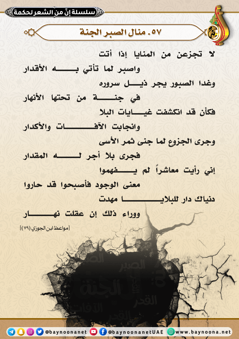 إنّ من الشعر لحكمة - (٥٧) منال الصبر الجنة تاريخ الإضافة: الخميس, 14/10/2021 - 13:52 التصنيفات صنف البطاقة: طلب العلم الشيخ: من إعداد شبكة بينونة سلسلة بطاقات: إنّ من الشعر لحكمة