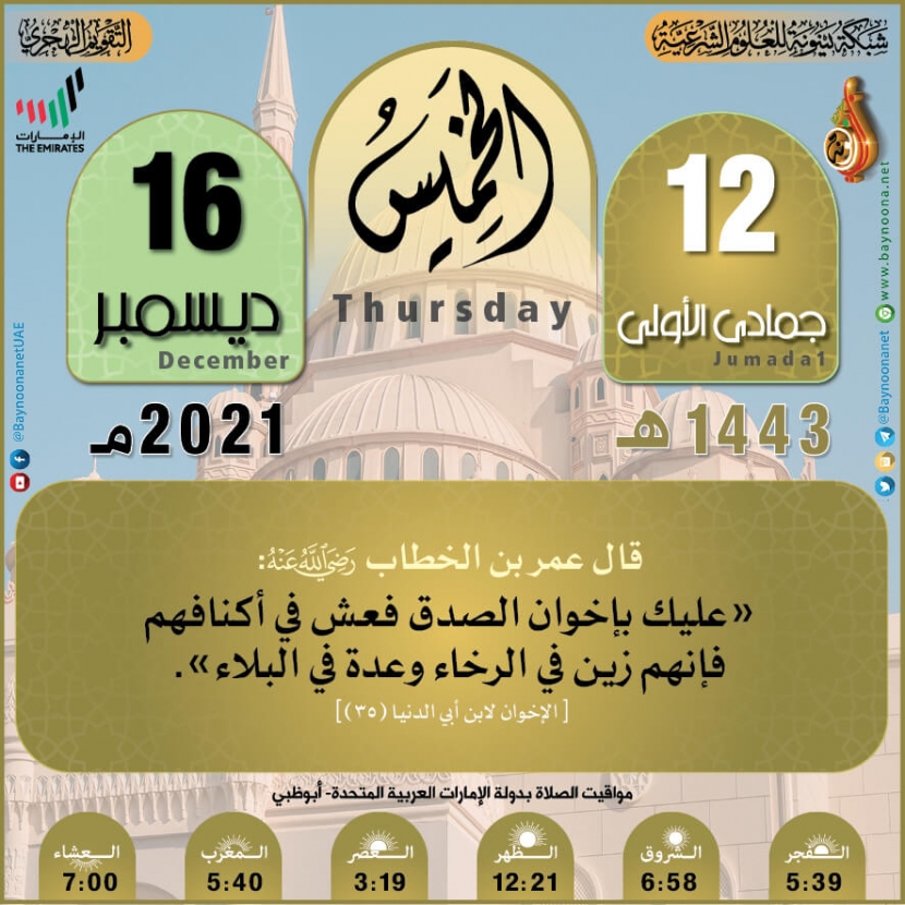 التقويم الهجري لعام ١٤٤٣ هـ - الخميس ١٢ جمادى الأولى تاريخ الإضافة: الأربعاء, 15/12/2021 - 22:55 التصنيفات صنف البطاقة: عامة الشيخ: من إعداد شبكة بينونة سلسلة بطاقات: التقويم الهجري لعام ١٤٤٣هـ حمل السلسلة كاملة: التقويم الهجري لعام ١٤٤٣ هـ - شهر المحرم حمل السلسلة كاملة: التقويم الهجري لعام ١٤٤٣ هـ - شهر صفر حمل السلسلة كاملة: التقويم الهجري لعام ١٤٤٣ هـ - شهر ربيع الأول حمل السلسلة كاملة: التقويم الهجري لعام ١٤٤٣ هـ - شهر ربيع الثاني حمل السلسلة كاملة: التقويم الهجري لعام ١٤٤٣ هـ - شهر جمادى الأولى حمل السلسلة كاملة: التقويم الهجري لعام ١٤٤٣ هـ - شهر جمادى الآخرة حمل السلسلة كاملة: التقويم الهجري لعام ١٤٤٣ هـ - شهر رجب حمل السلسلة كاملة: التقويم الهجري لعام ١٤٤٣ هـ - شهر شعبان حمل السلسلة كاملة: التقويم الهجري لعام ١٤٤٣ هـ - شهر رمضان حمل السلسلة كاملة: التقويم الهجري لعام ١٤٤٣ هـ - شهر شوال حمل السلسلة كاملة: التقويم الهجري لعام ١٤٤٣ هـ - شهر ذو القعدة حمل السلسلة كاملة: التقويم الهجري لعام ١٤٤٣ هـ - شهر ذو الحجة