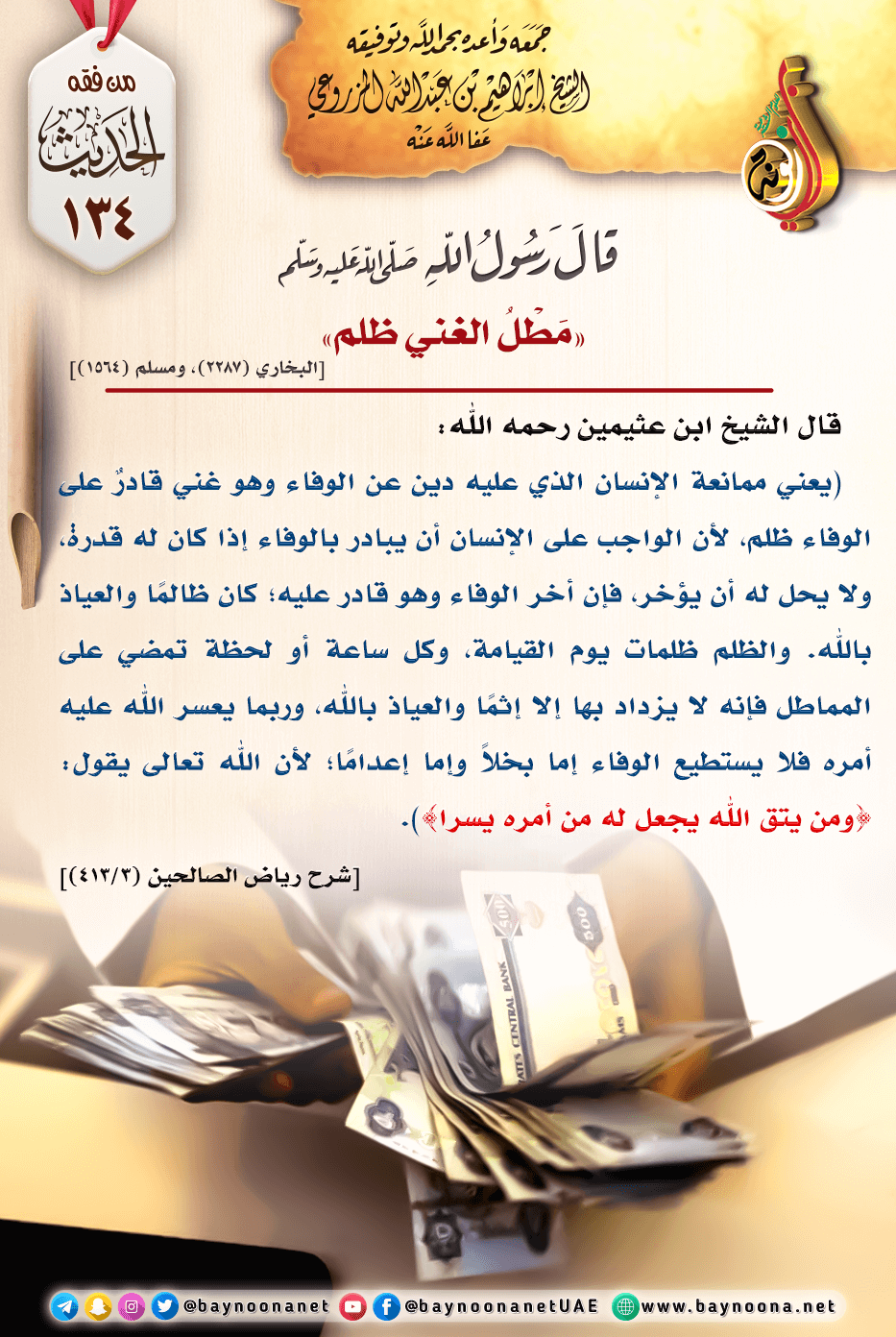 من فقه الحديث - (١٣٤) قال ﷺ: ( مطل الغني ظلم ) تاريخ الإضافة: الأحد, 02/01/2022 - 14:14 التصنيفات صنف البطاقة: الأخلاق والآداب الشيخ: إبراهيم بن عبد الله المزروعي سلسلة بطاقات: من فقه الحديث حمل السلسلة كاملة: من فقه الحديث (الجزء ١) حمل السلسلة كاملة: من فقه الحديث (الجزء ٢) حمل السلسلة كاملة: من فقه الحديث (الجزء ٣)