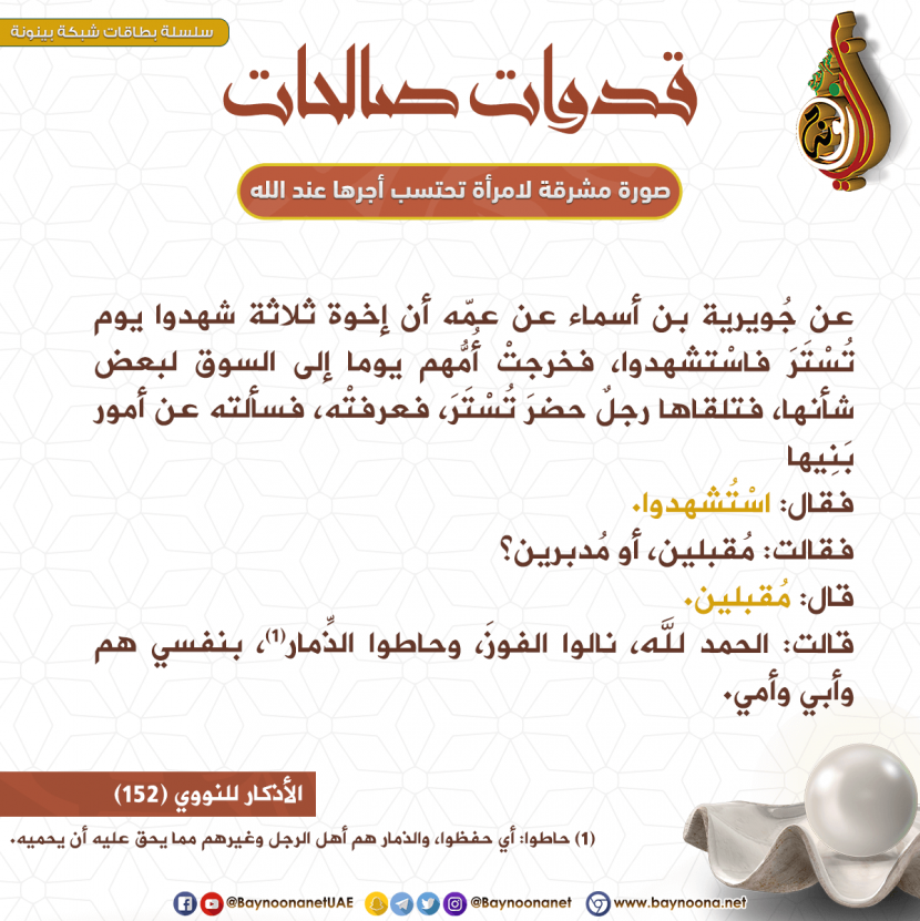 قدوات صالحات: صورة مشرقة لامرأة تحتسب أجرها عند الله تاريخ الإضافة: الثلاثاء, 04/01/2022 - 22:17 التصنيفات صنف البطاقة: إيمانيات صنف البطاقة: الأخلاق والآداب الشيخ: من إعداد شبكة بينونة