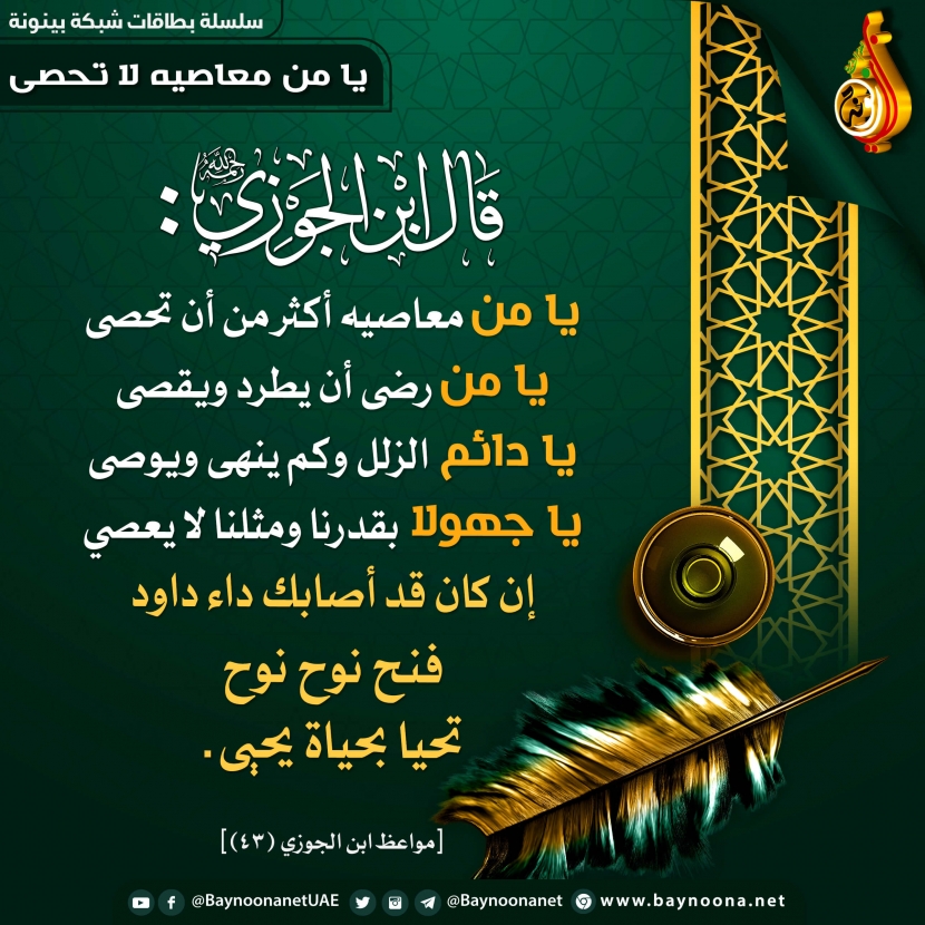 يا من معاصيه لا تحصى تاريخ الإضافة: الخميس, 20/01/2022 - 15:31 التصنيفات صنف البطاقة: التحذير من المعاصي الشيخ: من إعداد شبكة بينونة