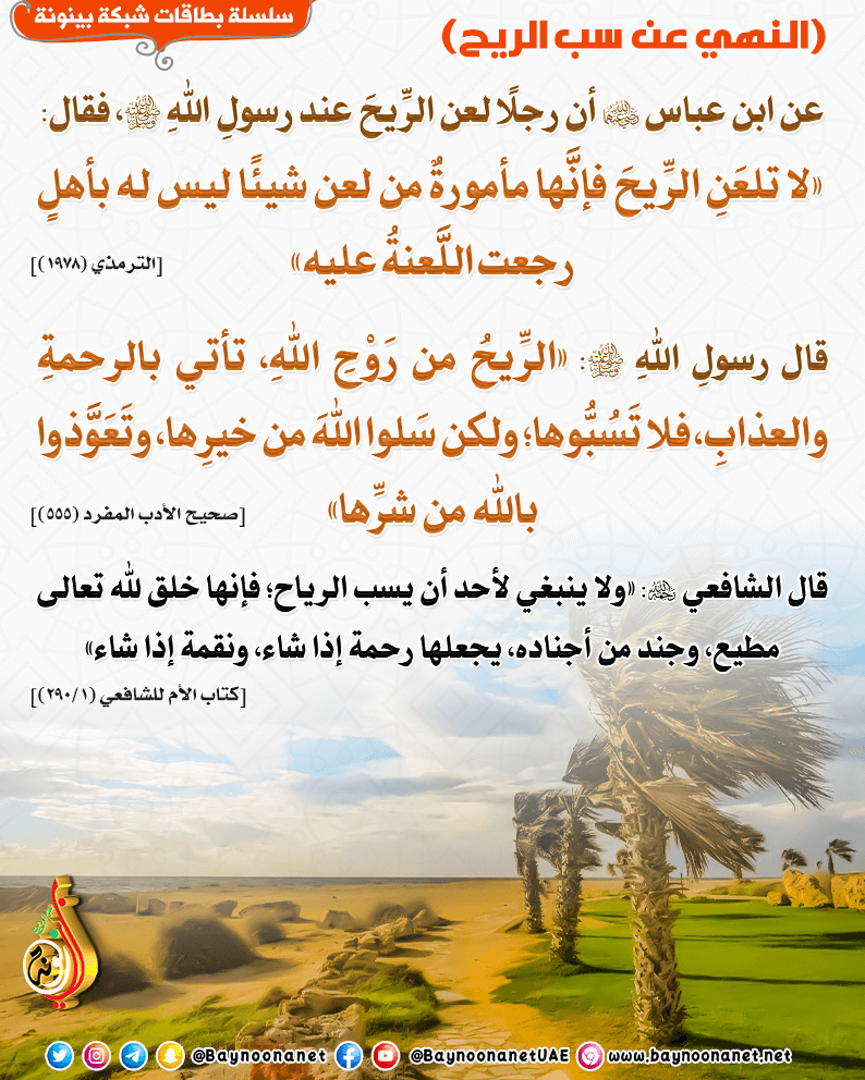 النهي عن سب الريح تاريخ الإضافة: السبت, 29/01/2022 - 22:05 التصنيفات صنف البطاقة: الأخلاق والآداب صنف البطاقة: التحذير من المعاصي الشيخ: من إعداد شبكة بينونة