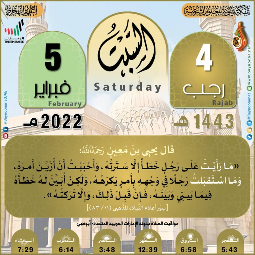 التقويم الهجري لعام ١٤٤٣ هـ - السبت ٠٤ رجب تاريخ الإضافة: الجمعة, 04/02/2022 - 22:24 التصنيفات صنف البطاقة: عامة الشيخ: من إعداد شبكة بينونة سلسلة بطاقات: التقويم الهجري لعام ١٤٤٣هـ حمل السلسلة كاملة: التقويم الهجري لعام ١٤٤٣ هـ - شهر المحرم حمل السلسلة كاملة: التقويم الهجري لعام ١٤٤٣ هـ - شهر صفر حمل السلسلة كاملة: التقويم الهجري لعام ١٤٤٣ هـ - شهر ربيع الأول حمل السلسلة كاملة: التقويم الهجري لعام ١٤٤٣ هـ - شهر ربيع الثاني حمل السلسلة كاملة: التقويم الهجري لعام ١٤٤٣ هـ - شهر جمادى الأولى حمل السلسلة كاملة: التقويم الهجري لعام ١٤٤٣ هـ - شهر جمادى الآخرة حمل السلسلة كاملة: التقويم الهجري لعام ١٤٤٣ هـ - شهر رجب حمل السلسلة كاملة: التقويم الهجري لعام ١٤٤٣ هـ - شهر شعبان حمل السلسلة كاملة: التقويم الهجري لعام ١٤٤٣ هـ - شهر رمضان حمل السلسلة كاملة: التقويم الهجري لعام ١٤٤٣ هـ - شهر شوال حمل السلسلة كاملة: التقويم الهجري لعام ١٤٤٣ هـ - شهر ذو القعدة حمل السلسلة كاملة: التقويم الهجري لعام ١٤٤٣ هـ - شهر ذو الحجة