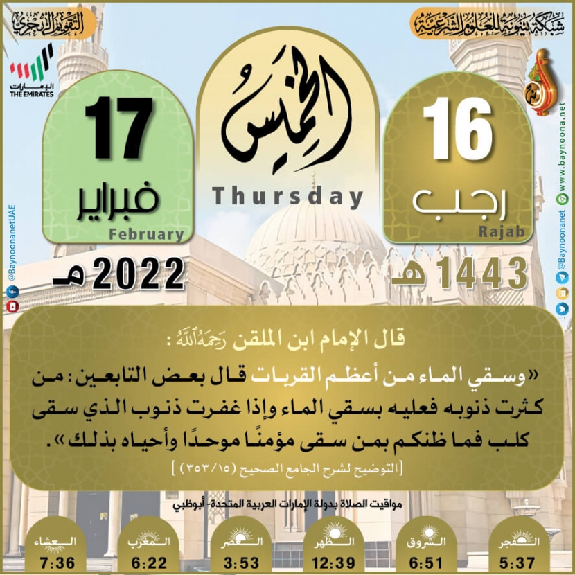 التقويم الهجري لعام ١٤٤٣ هـ - الخميس ١٦ رجب تاريخ الإضافة: الأربعاء, 16/02/2022 - 20:31 التصنيفات صنف البطاقة: عامة الشيخ: من إعداد شبكة بينونة سلسلة بطاقات: التقويم الهجري لعام ١٤٤٣هـ حمل السلسلة كاملة: التقويم الهجري لعام ١٤٤٣ هـ - شهر المحرم حمل السلسلة كاملة: التقويم الهجري لعام ١٤٤٣ هـ - شهر صفر حمل السلسلة كاملة: التقويم الهجري لعام ١٤٤٣ هـ - شهر ربيع الأول حمل السلسلة كاملة: التقويم الهجري لعام ١٤٤٣ هـ - شهر ربيع الثاني حمل السلسلة كاملة: التقويم الهجري لعام ١٤٤٣ هـ - شهر جمادى الأولى حمل السلسلة كاملة: التقويم الهجري لعام ١٤٤٣ هـ - شهر جمادى الآخرة حمل السلسلة كاملة: التقويم الهجري لعام ١٤٤٣ هـ - شهر رجب حمل السلسلة كاملة: التقويم الهجري لعام ١٤٤٣ هـ - شهر شعبان حمل السلسلة كاملة: التقويم الهجري لعام ١٤٤٣ هـ - شهر رمضان حمل السلسلة كاملة: التقويم الهجري لعام ١٤٤٣ هـ - شهر شوال حمل السلسلة كاملة: التقويم الهجري لعام ١٤٤٣ هـ - شهر ذو القعدة حمل السلسلة كاملة: التقويم الهجري لعام ١٤٤٣ هـ - شهر ذو الحجة