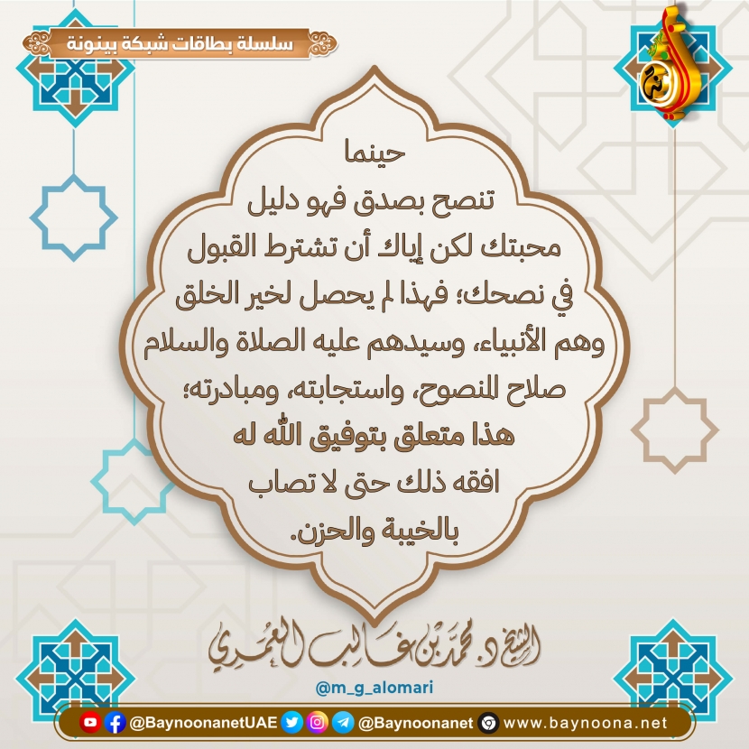 حينما تنصح بصدق فهو دليل على محبتك ... تاريخ الإضافة: الأربعاء, 16/02/2022 - 18:47 التصنيفات صنف البطاقة: الأخلاق والآداب الشيخ: د. محمد بن غالب العمري