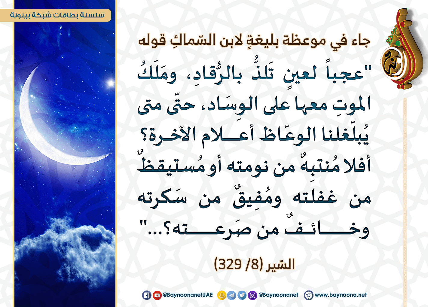 جاء في موعظة بليغة لابن السماك قوله: ( عجبا لعين تلذ بالرقاد ، وملك الموت معها على الوساد ...) تاريخ الإضافة: الإثنين, 28/02/2022 - 22:19 التصنيفات صنف البطاقة: إيمانيات الشيخ: من إعداد شبكة بينونة