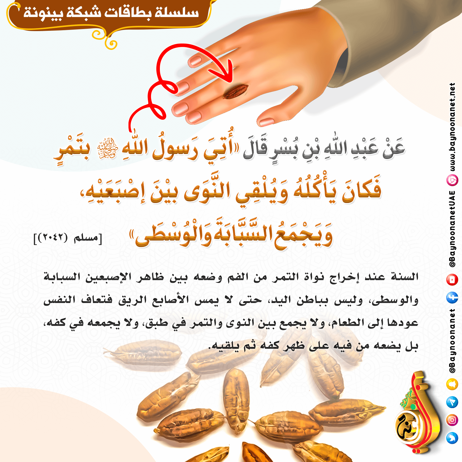 عن عبد الله بن بسر قال: ( أتي رسول الله ﷺ بتمر فكان يأكل منه ويلقي النوى بين إصبعيه ...) تاريخ الإضافة: الأحد, 13/02/2022 - 13:34 التصنيفات صنف البطاقة: الأخلاق والآداب الشيخ: من إعداد شبكة بينونة