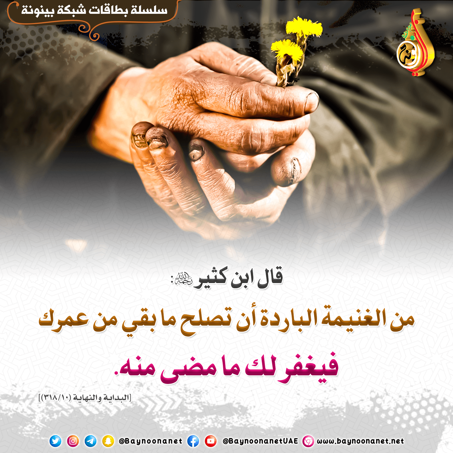 قال ابن كثير - رحمه الله -: ( من الغنيمة الباردة أن تصلح ما بقي من عمرك فيغفر لك ما مضى منه ) تاريخ الإضافة: الأحد, 13/03/2022 - 13:18 التصنيفات صنف البطاقة: إيمانيات الشيخ: من إعداد شبكة بينونة