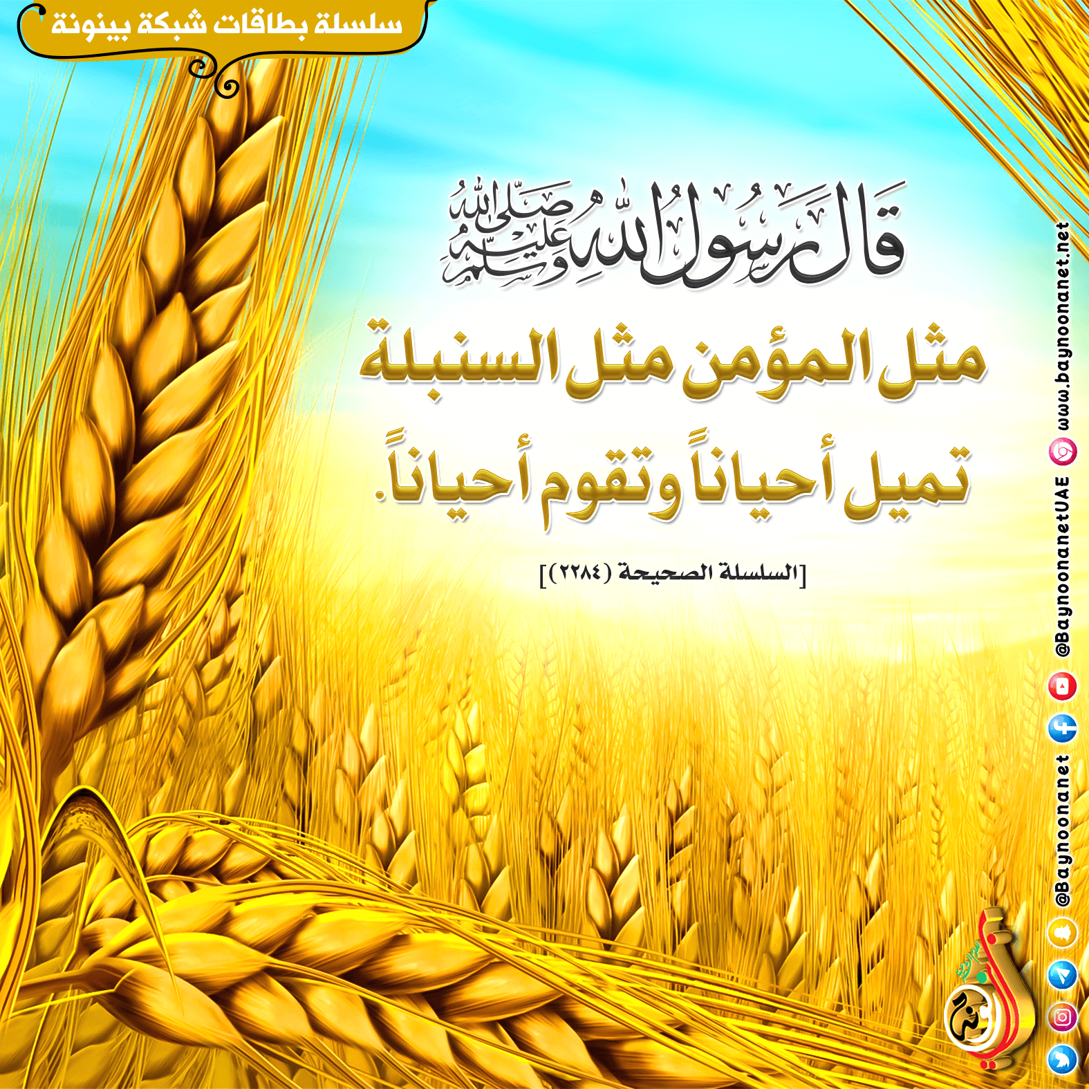 قال رسول الله ﷺ : ( مثل المؤمن مثل السنبلة تميل أحيانا وتقوم أحيانا. ) تاريخ الإضافة: الجمعة, 18/03/2022 - 22:35 التصنيفات صنف البطاقة: إيمانيات الشيخ: من إعداد شبكة بينونة