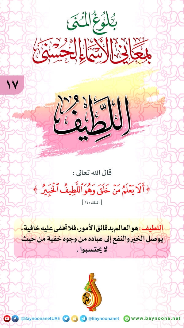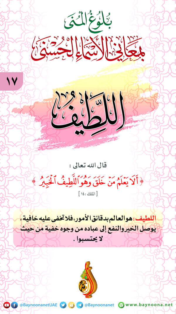 بلوغ المنى بمعاني الأسماء الحسنى - (١٧) اللطيف تاريخ الإضافة: الإثنين, 30/05/2022 - 18:57 التصنيفات صنف البطاقة: إيمانيات الشيخ: من إعداد شبكة بينونة سلسلة بطاقات: بلوغ المنى بمعاني الأسماء الحسنى حمل السلسلة كاملة: بلوغ المنى بمعاني الأسماء الحسنى