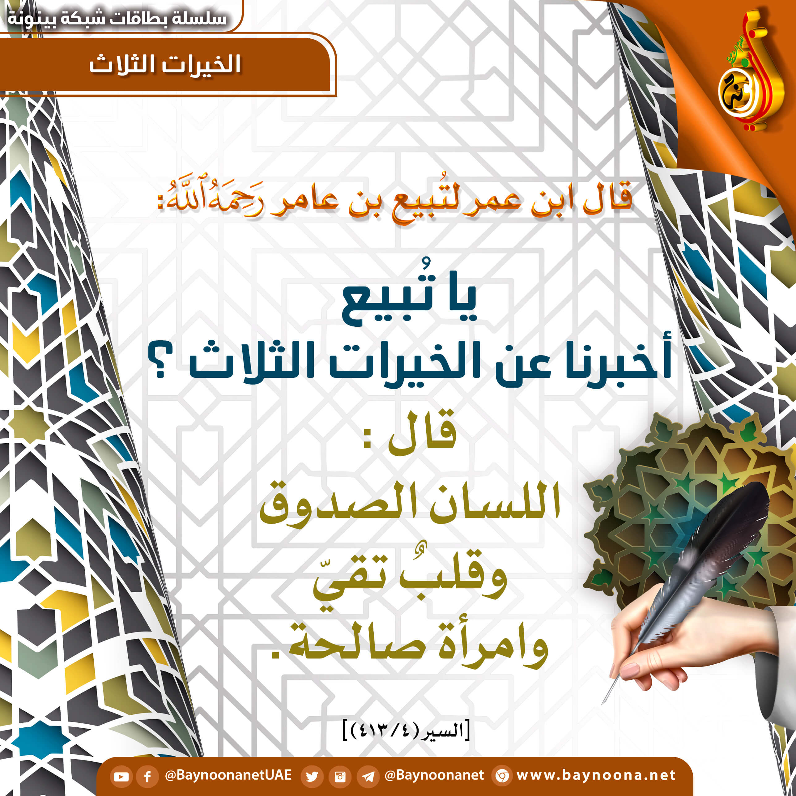 الخيرات الثلاث تاريخ الإضافة: الإثنين, 06/06/2022 - 18:59 التصنيفات صنف البطاقة: إيمانيات صنف البطاقة: الأخلاق والآداب الشيخ: من إعداد شبكة بينونة