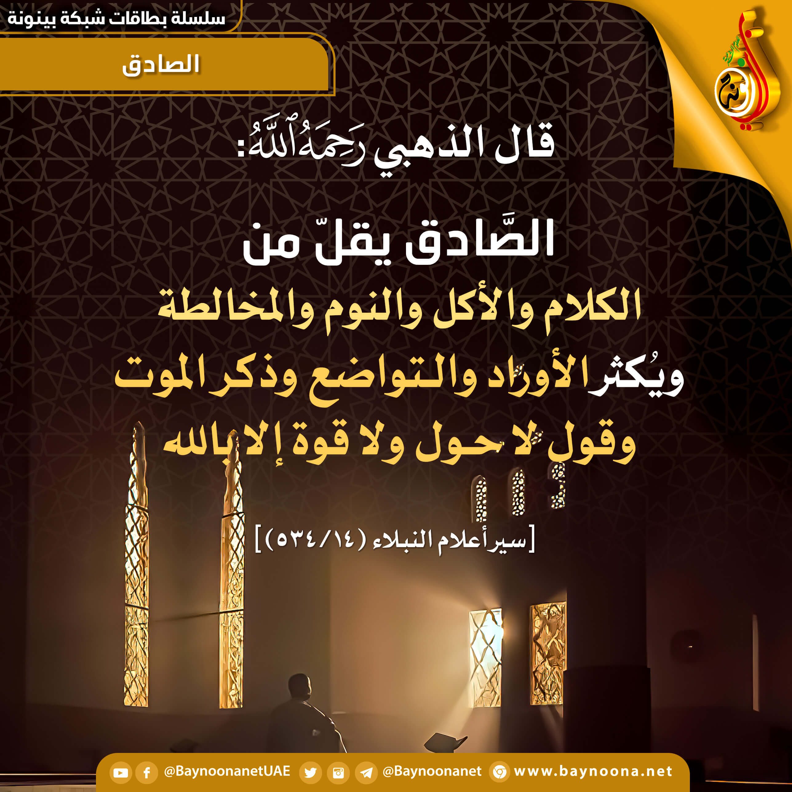 الصادق تاريخ الإضافة: الأربعاء, 08/06/2022 - 21:25 التصنيفات صنف البطاقة: إيمانيات صنف البطاقة: الأخلاق والآداب الشيخ: من إعداد شبكة بينونة