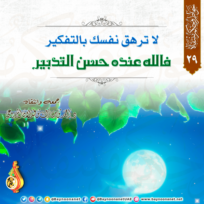 خواطر وحكم منتقاة - (٢٩) لا ترهق نفسك بالتفكير فالله عنده حسن التدبير تاريخ الإضافة: الأربعاء, 13/07/2022 - 17:42 التصنيفات صنف البطاقة: إيمانيات صنف البطاقة: الأخلاق والآداب الشيخ: د. أحمد بن مبارك المزروعي سلسلة بطاقات: خواطر وحكم منتقاة حمل السلسلة كاملة: خواطر وحكم منتقاة