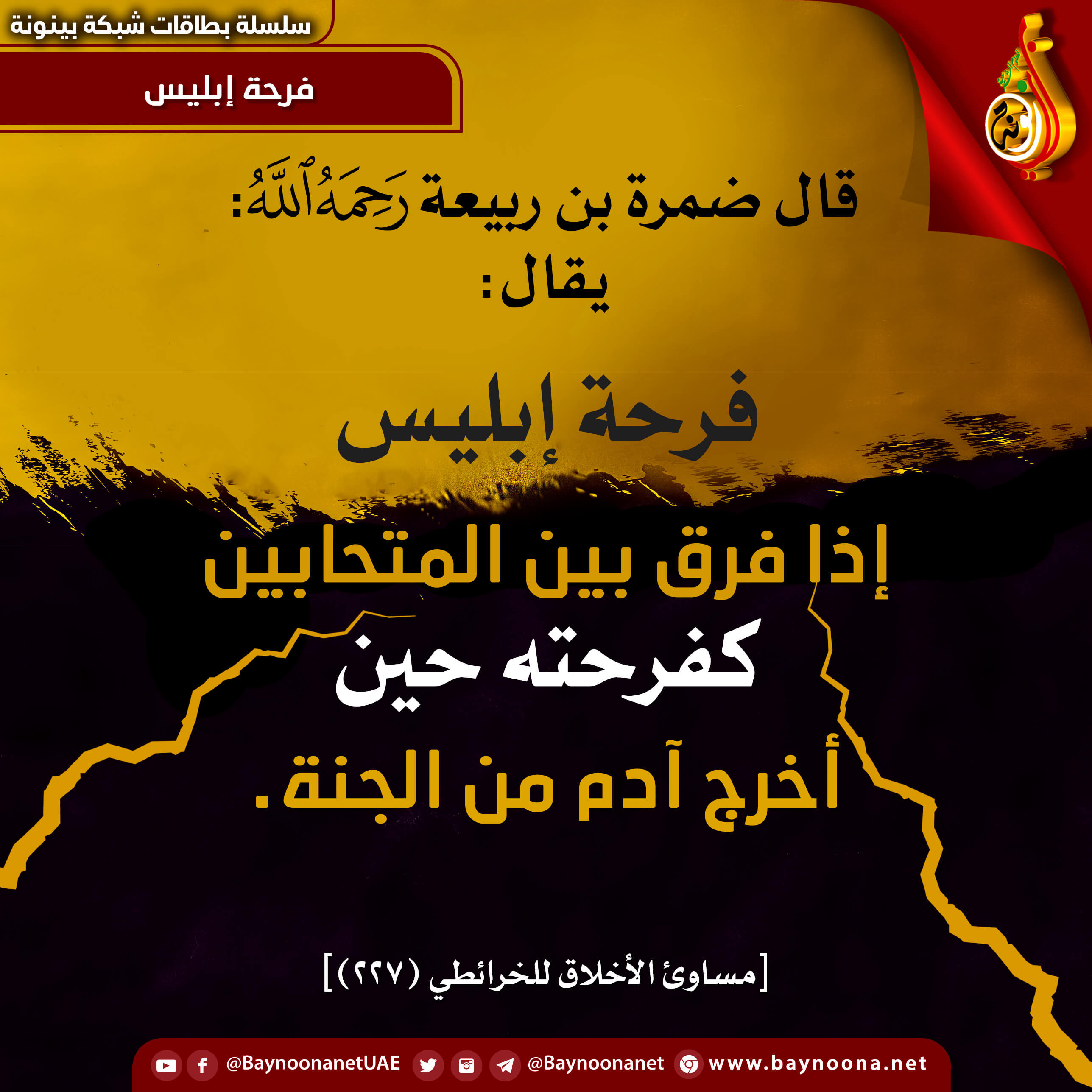 فرحة إبليس تاريخ الإضافة: الخميس, 14/07/2022 - 19:16 التصنيفات صنف البطاقة: إيمانيات صنف البطاقة: الأخلاق والآداب الشيخ: من إعداد شبكة بينونة
