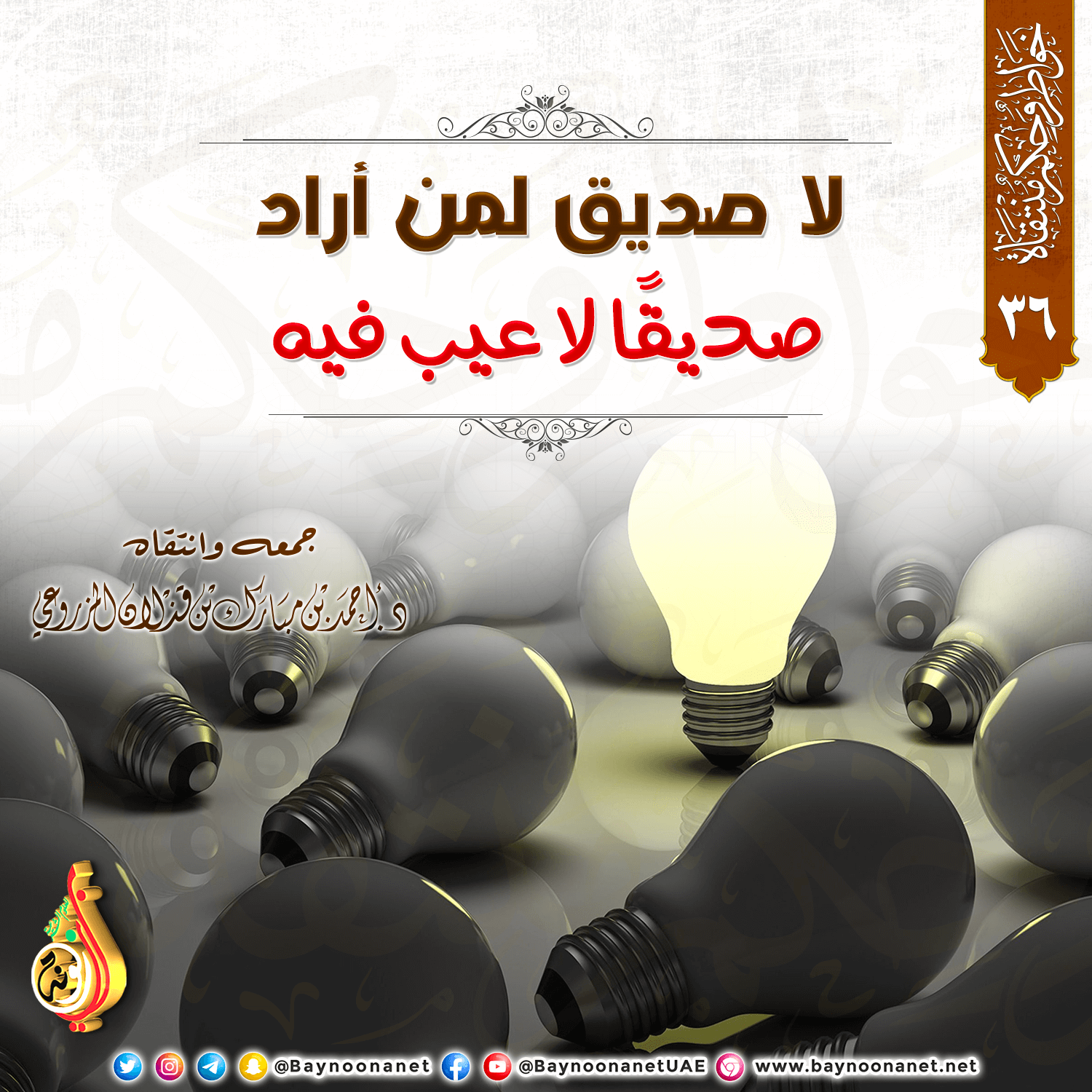 خواطر وحكم منتقاة - (٣٦) لا صديق لمن أراد صديقا لا عيب فيه تاريخ الإضافة: الأربعاء, 20/07/2022 - 22:05 التصنيفات صنف البطاقة: الأخلاق والآداب الشيخ: د. أحمد بن مبارك المزروعي سلسلة بطاقات: خواطر وحكم منتقاة حمل السلسلة كاملة: خواطر وحكم منتقاة