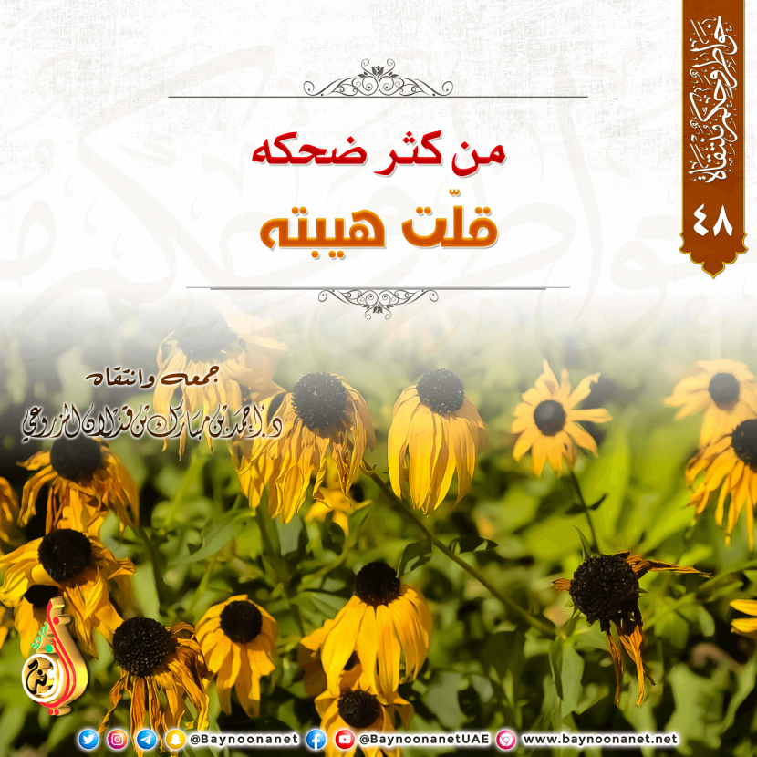 خواطر وحكم منتقاة - (٤٨) من كثر ضحكه قلت هيبته تاريخ الإضافة: الثلاثاء, 09/08/2022 - 16:32 التصنيفات صنف البطاقة: الأخلاق والآداب الشيخ: د. أحمد بن مبارك المزروعي سلسلة بطاقات: خواطر وحكم منتقاة حمل السلسلة كاملة: خواطر وحكم منتقاة