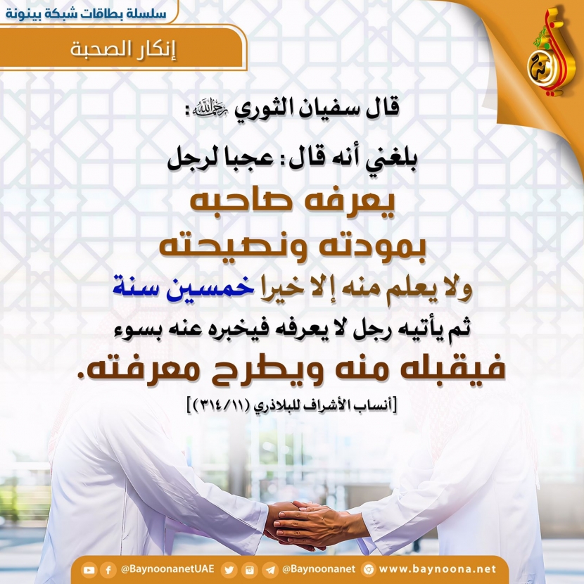إنكار الصحبة تاريخ الإضافة: الإثنين, 15/08/2022 - 21:49 التصنيفات صنف البطاقة: الأخلاق والآداب الشيخ: من إعداد شبكة بينونة