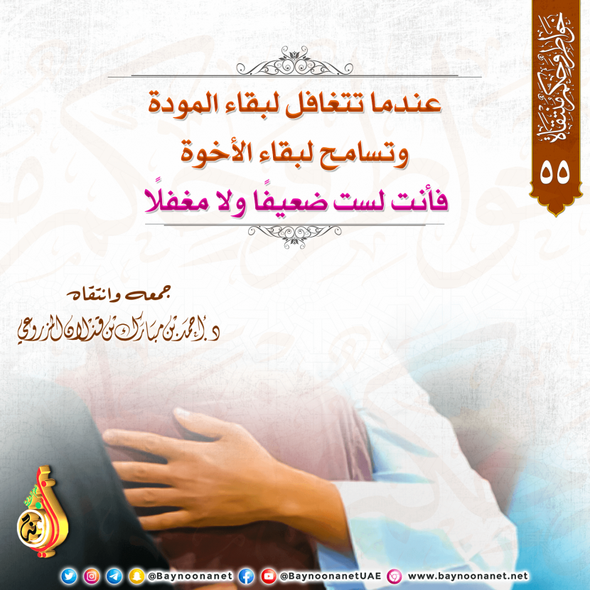 خواطر وحكم منتقاة - (٥٥) عندما تتغافل لبقاء المودة ... تاريخ الإضافة: الأربعاء, 17/08/2022 - 21:51 التصنيفات صنف البطاقة: الأخلاق والآداب الشيخ: د. أحمد بن مبارك المزروعي سلسلة بطاقات: خواطر وحكم منتقاة حمل السلسلة كاملة: خواطر وحكم منتقاة