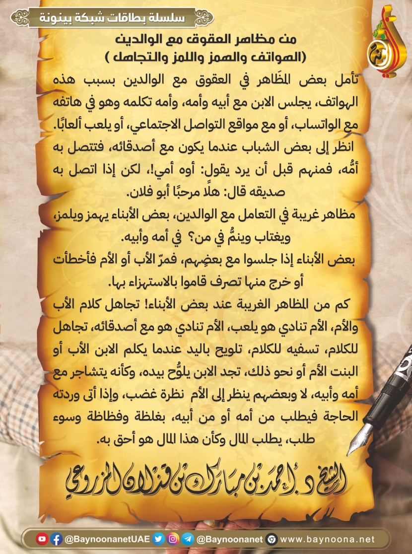 من مظاهر العقوق مع الوالدين ( الهواتف والهمز واللهز والتجاهل ) تاريخ الإضافة: الجمعة, 26/08/2022 - 01:44 التصنيفات صنف البطاقة: الأخلاق والآداب صنف البطاقة: بر الوالدين الشيخ: د. أحمد بن مبارك المزروعي