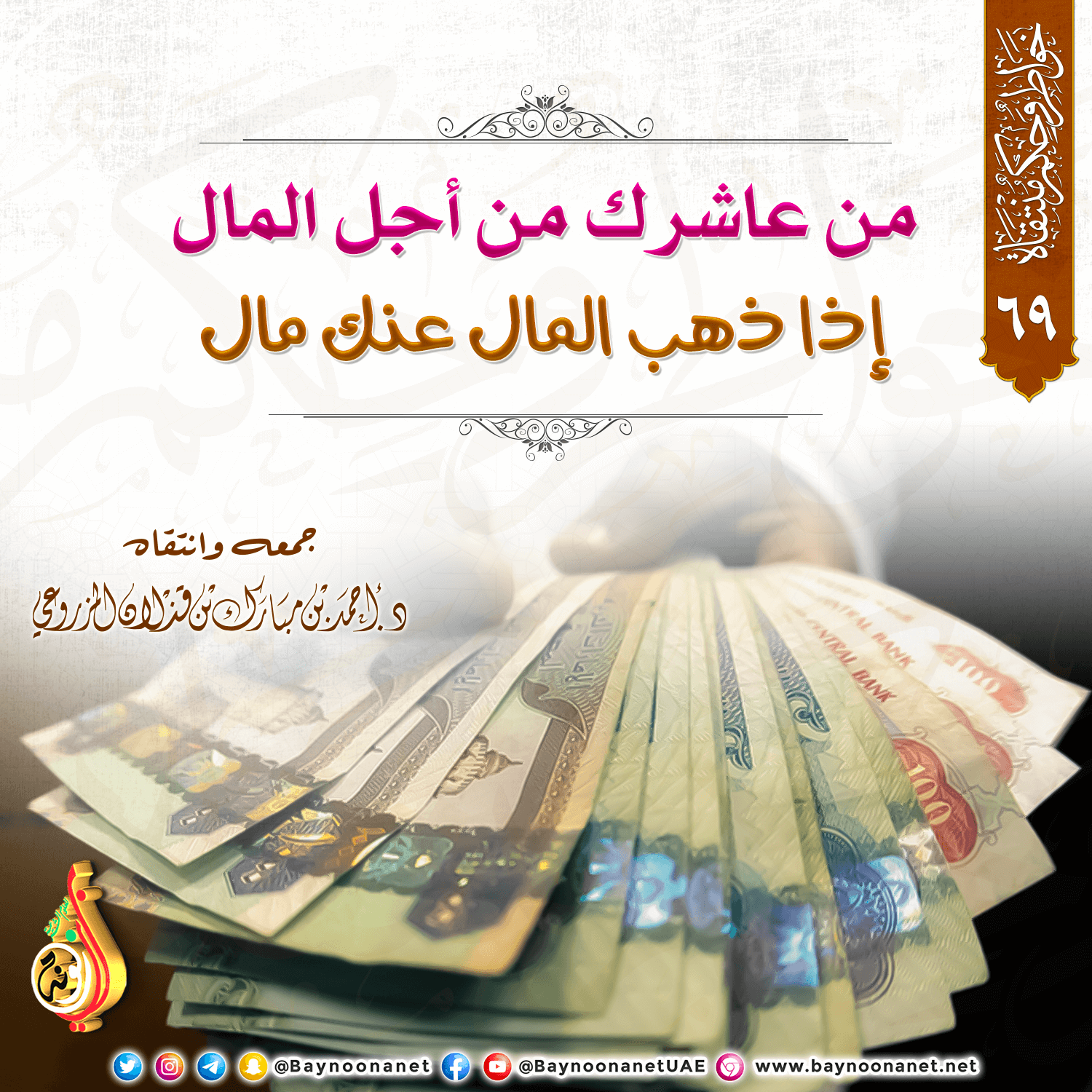 خواطر وحكم منتقاة - (٦٩) من عاشرك من أجل المال ... تاريخ الإضافة: السبت, 03/09/2022 - 21:37 التصنيفات صنف البطاقة: الأخلاق والآداب الشيخ: د. أحمد بن مبارك المزروعي سلسلة بطاقات: خواطر وحكم منتقاة حمل السلسلة كاملة: خواطر وحكم منتقاة